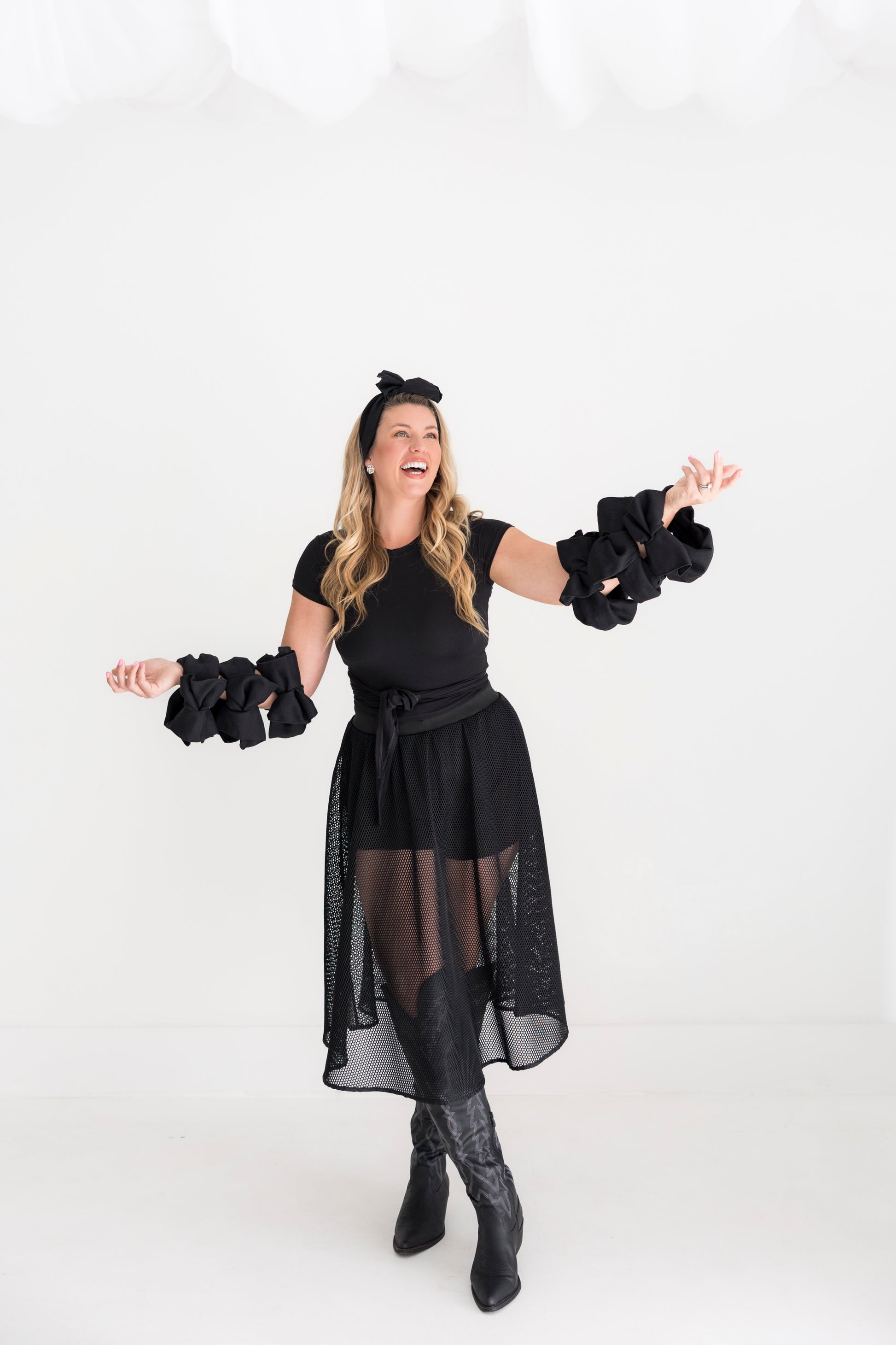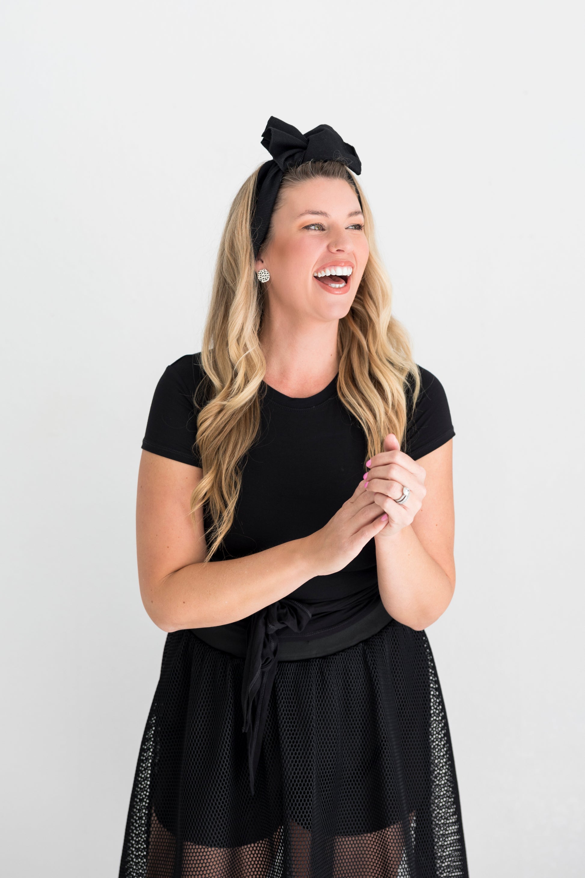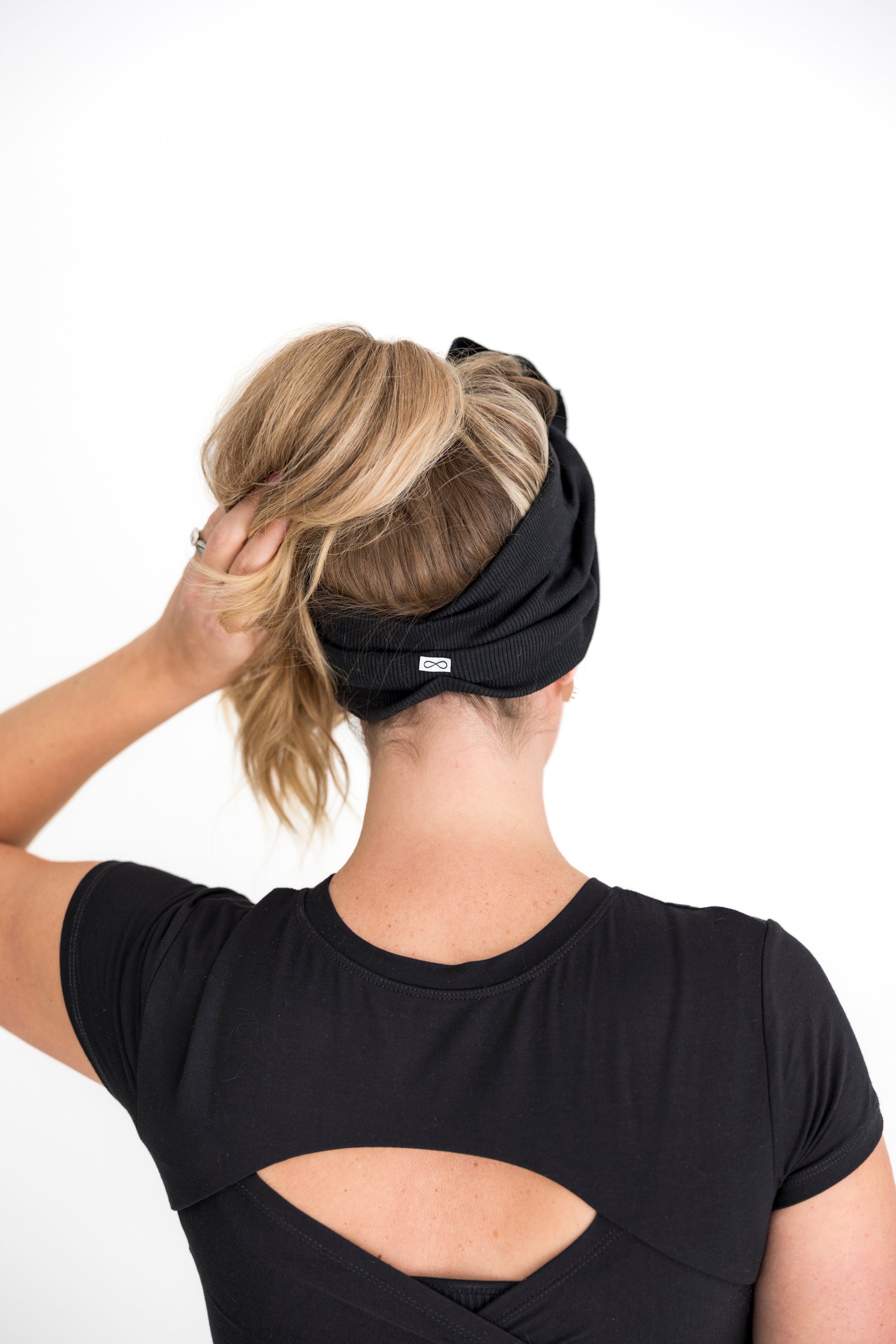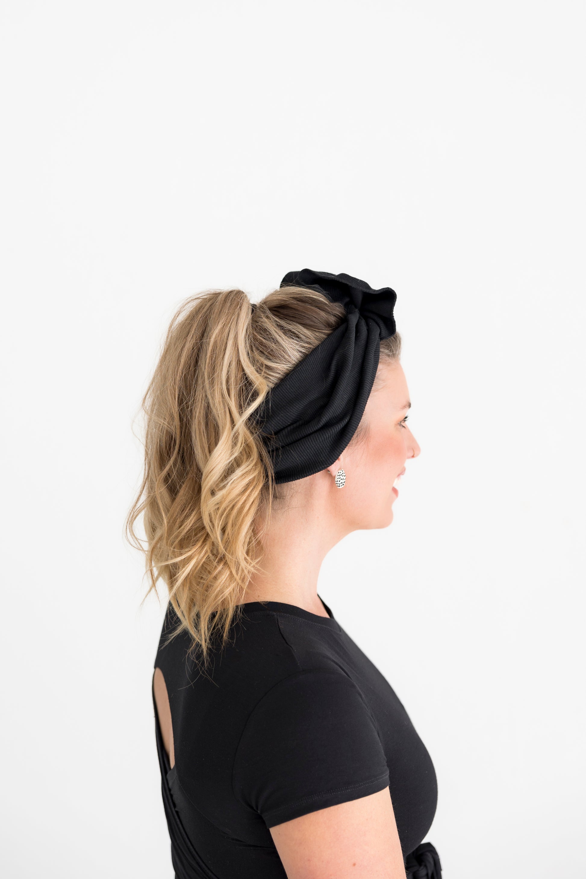 This is a stretchy full-circle headband that comes tied—just slip it on, snap it in, and go.